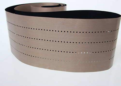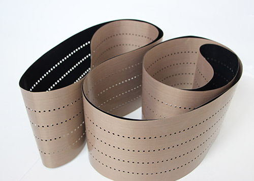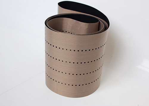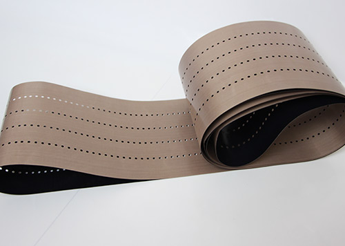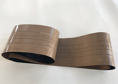 串焊機打孔特氟龍輸送帶采用高強度玻璃纖維紗或凱芙拉(芳綸)經圓織設備編織筒狀織物,采用工藝技術涂覆特氟龍樹脂(PTFE)制成的。它克服以往輸送帶接口連接處易斷裂的現象。連接處周長不等而造成走行穩定性差、跑偏現象。無縫皮帶運轉壽命比任何接法的特氟龍輸送帶壽命都要長3倍以上。