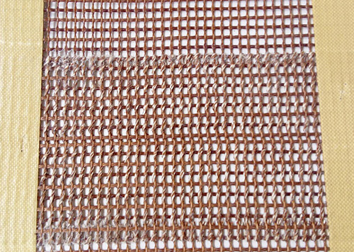 2.墻式接頭法:在網帶的兩頭分別用凱夫拉高溫布做圓柱狀的布條子,客戶也是直接用我們配好的鋼絲直接穿進凱夫拉高溫布的小孔里面就行了。這種接頭方式的好處就是接頭處很耐磨,但是抗拉強度并不是很高。